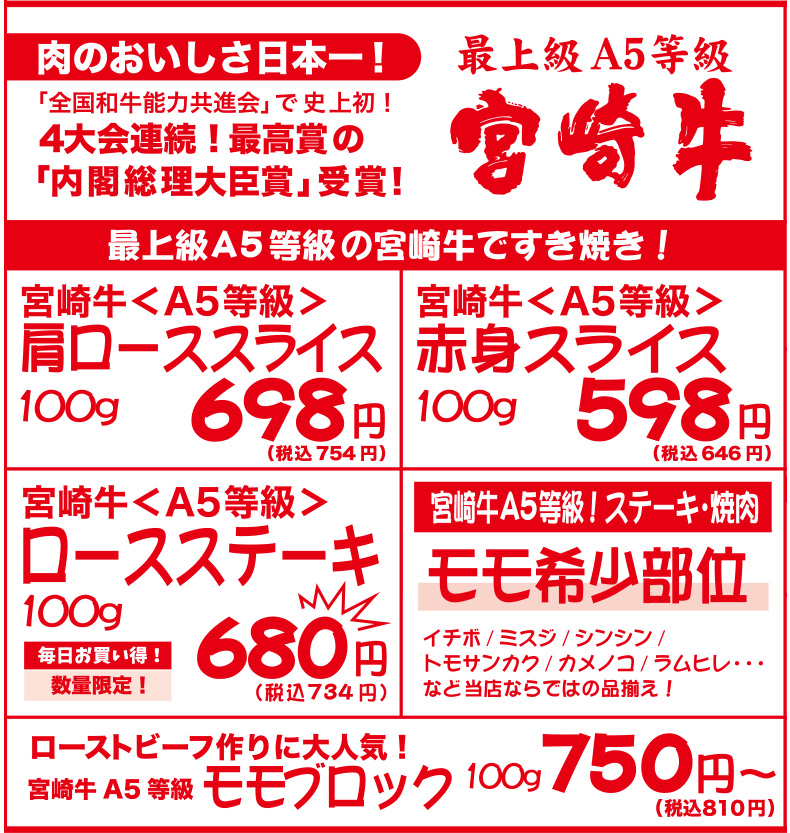 一頭買いで仕入れた国内屈指の黒毛和牛「宮崎牛」を中心に